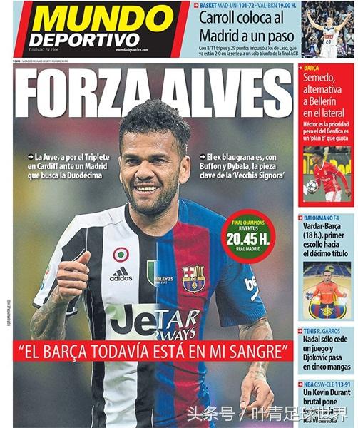 《世界体育报》的头版头条是“FORZA ALVES”,这是给阿尔维斯加油,也是在给尤文加油。当然,《世界体育报》的理由似乎更充分:阿尔维斯在巴萨效力8年,是梦三王朝的基石人物,梅西的最佳拍档。