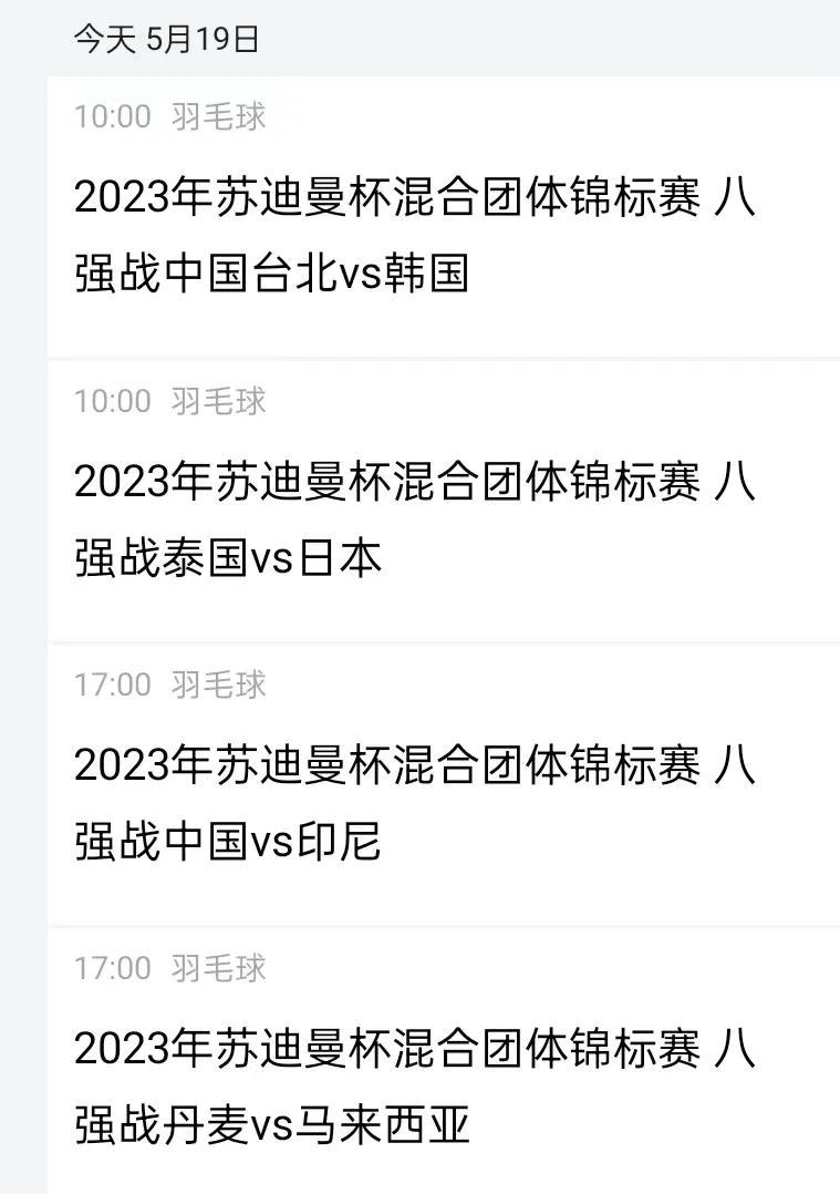 05月19日,苏迪曼杯羽毛球赛1/4决赛,全面开赛,央视体育客户端全程直播。