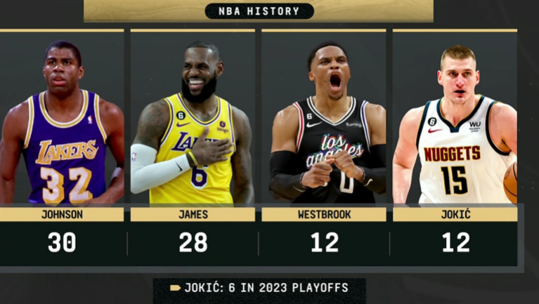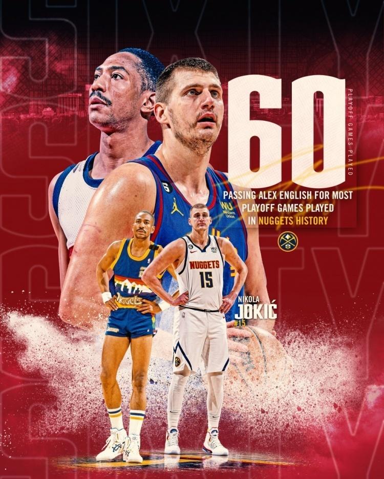 这是约基奇季后赛生涯的第12次三双,他追平了威少,并列季后赛历史第三。排在第一的是魔术师约翰逊(30次),第二是詹姆斯(28次)。这也是约基奇生涯第60场季后赛,他超过了名宿英格利什(59场),独占掘金队史第一。