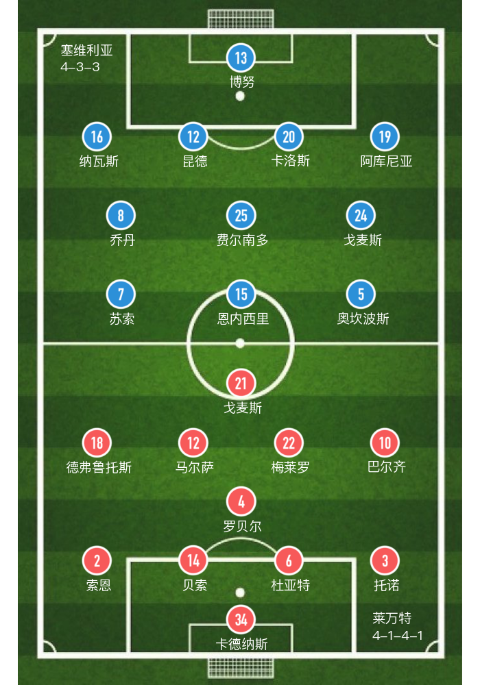 塞维利亚(4-3-3): 13-博努,16-纳瓦斯,12-昆德(86' 6-古德里),20-卡洛斯,19-阿库尼亚,8-乔丹,25-费尔南多,24-戈麦斯(86' 14-罗德里格斯),7-苏索(75' 10-拉基蒂奇),15-恩内西里,5-奥坎波斯(89' 11-穆尼尔)