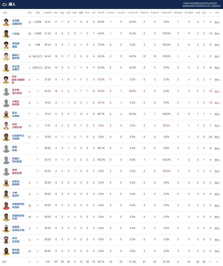 洛杉矶湖人里夫斯16分5板7助3断,多尔顿-克内克特16分3板2助1断1帽,拉塞尔14分3助1断1帽;