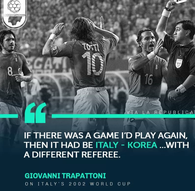 多次的飞铲和肘击没有判罚,让意大利队的心理出现了失衡,注意力也逐渐给分散,更多地陷入了与韩国队的肉搏与裁判的争执之中,而帕努奇在比赛尾声的失误让薛琦铉扳平比分,比赛就这样被拖进了加时赛。