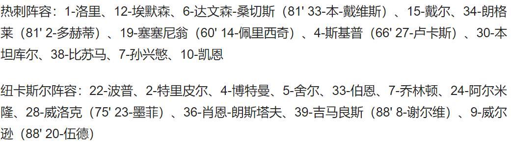 第54分钟,热刺利用角球机会扳回一城,孙兴慜把左侧角球开到禁区,前点头球后蹭,后点的凯恩俯冲顶空门得手,热刺1-2纽卡。