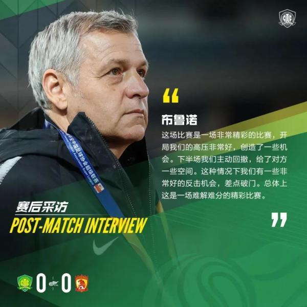 赛后国安队主教练布鲁诺充分肯定了队员们在场上的发挥,的确,从整场比赛来看,两支球队为球迷奉献了一场精彩的对决,在技战术层面发挥了非常高的水平,唯一美中不足的就是没有进球。
