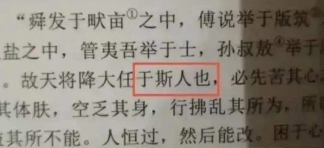 从篇章来看,此句话前面列举了管夷吾、百里奚、孙叔敖等大家人物,后面则总结要成为名人所需种种历练,所以这句话可以理解为过渡句。由此,作为指代,"斯人"与"是人"都是解释的通的,指的这类人。但是,我们也看到,是字还有肯定、加强语气之意,从文章结构看,作者立意十足,溢美之心扬扬洒洒,要表达的观点与目的相当明显,因此采用"是"比"斯"更具气势。而且据考究,在先秦典词中,"是"字用起来很唯妙,也是用的是最多的代词,所以"是"应该更为确切。