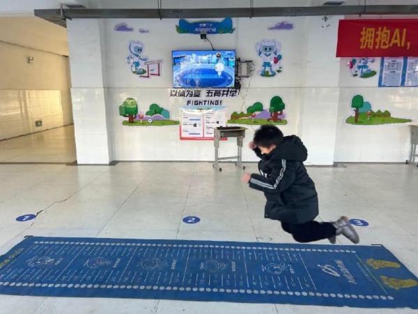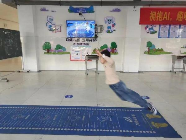 本次比赛启用AI辅助评分体系,通过计算机视觉技术算法与深度学习方法,向选手的身体及其周边投射红外线,完成动作追踪及运动轨迹的检测和数据传输,以确保比赛公平。学生通过人脸识别进行身份认证后,根据AI语音提示及人体手势动作识别开始运动,运动结束后大屏自动展示学生跳绳、跳远、开合跳成绩。学生可以通过人脸登录认证查看个人运动成绩及数据分析,成绩将同步到学校AI运动小站管理平台。