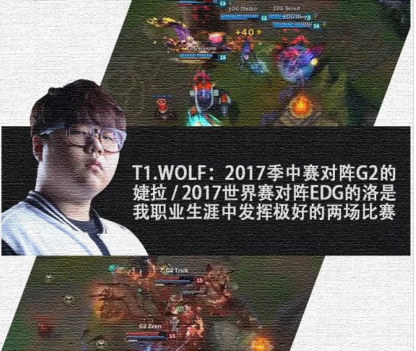 在接下来记者问了一个很有趣的问题,有哪些比赛你认为是自己发挥特别好的,可以让大家反复回放的那种比赛。Wolf则表示:事实上我记得并不太清楚,但如果非要我说的话,我觉得在17年对阵EDG那场比赛中我使用洛完成了惊天翻盘,我感觉我做的很不错。除此之外,还有在17年MSI上对阵G2我的婕拉表现也非常完美,我依然记得我在30秒之前就谋划了那个大招,最终的结果也和我预料的一样。