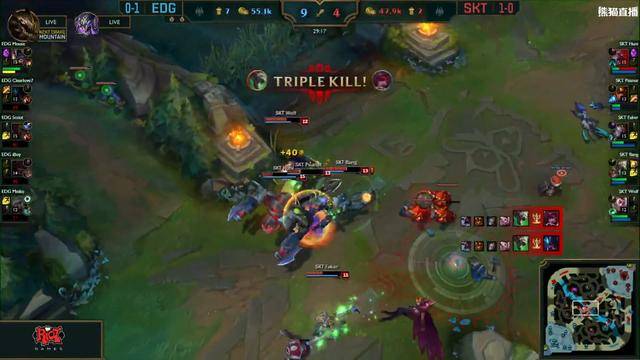 4分钟SN河道视野看到岩雀,鳄鱼直接在SN一塔后断了铁男兵线,铁男强行回到塔下,岩雀想要越塔强杀,岩突打出铁男闪现后自己抗塔也交出闪现,盲僧赶到盲Q拿到一血。