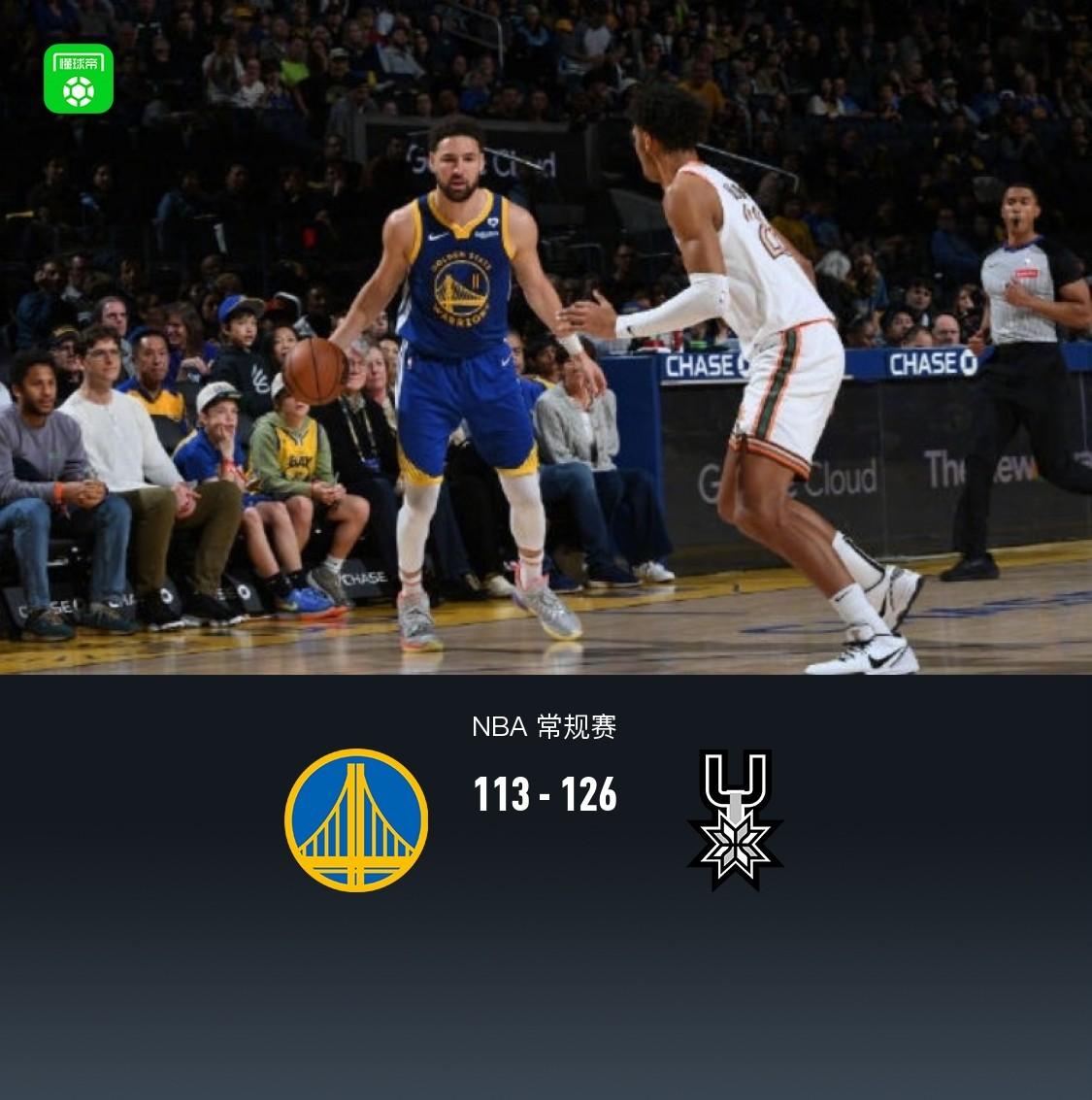 第四节勇士库明加拿下19分,马刺巴洛拿下7分,最终勇士113-126不敌马刺