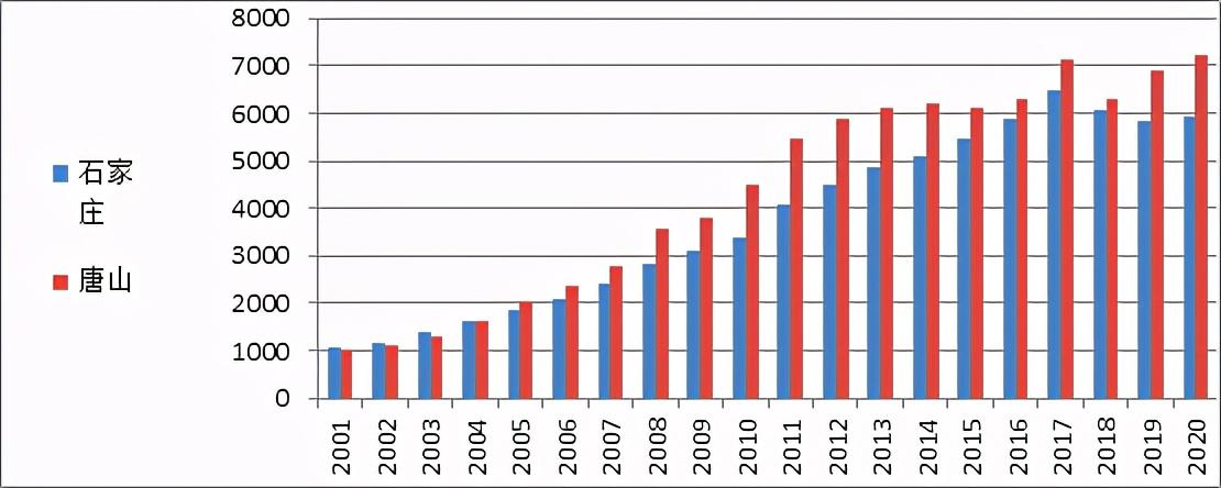 下图柱状图比较明显,2004年以前石家庄GDP略高于唐山,后被唐山超过,虽在15、16、17、18年逐渐缩小差距,但后又被逐渐拉开。