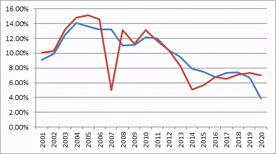 下图,蓝色为石家庄GDP增速,红色为唐山GDP增速