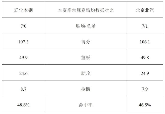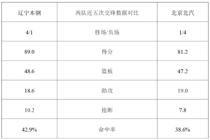 辽宁队上轮客场102-91战胜新疆队;北京主场108-98击败深圳队。
