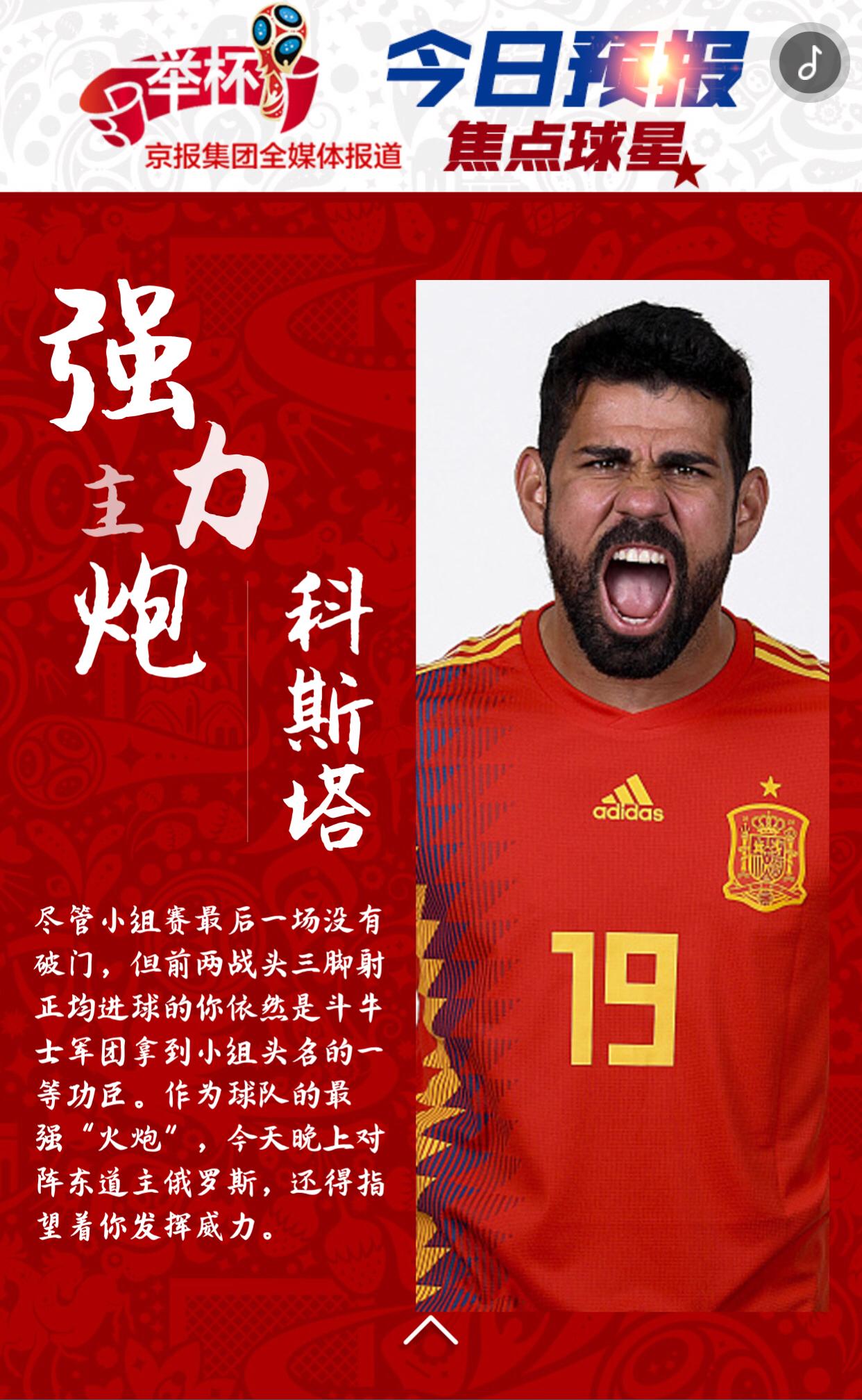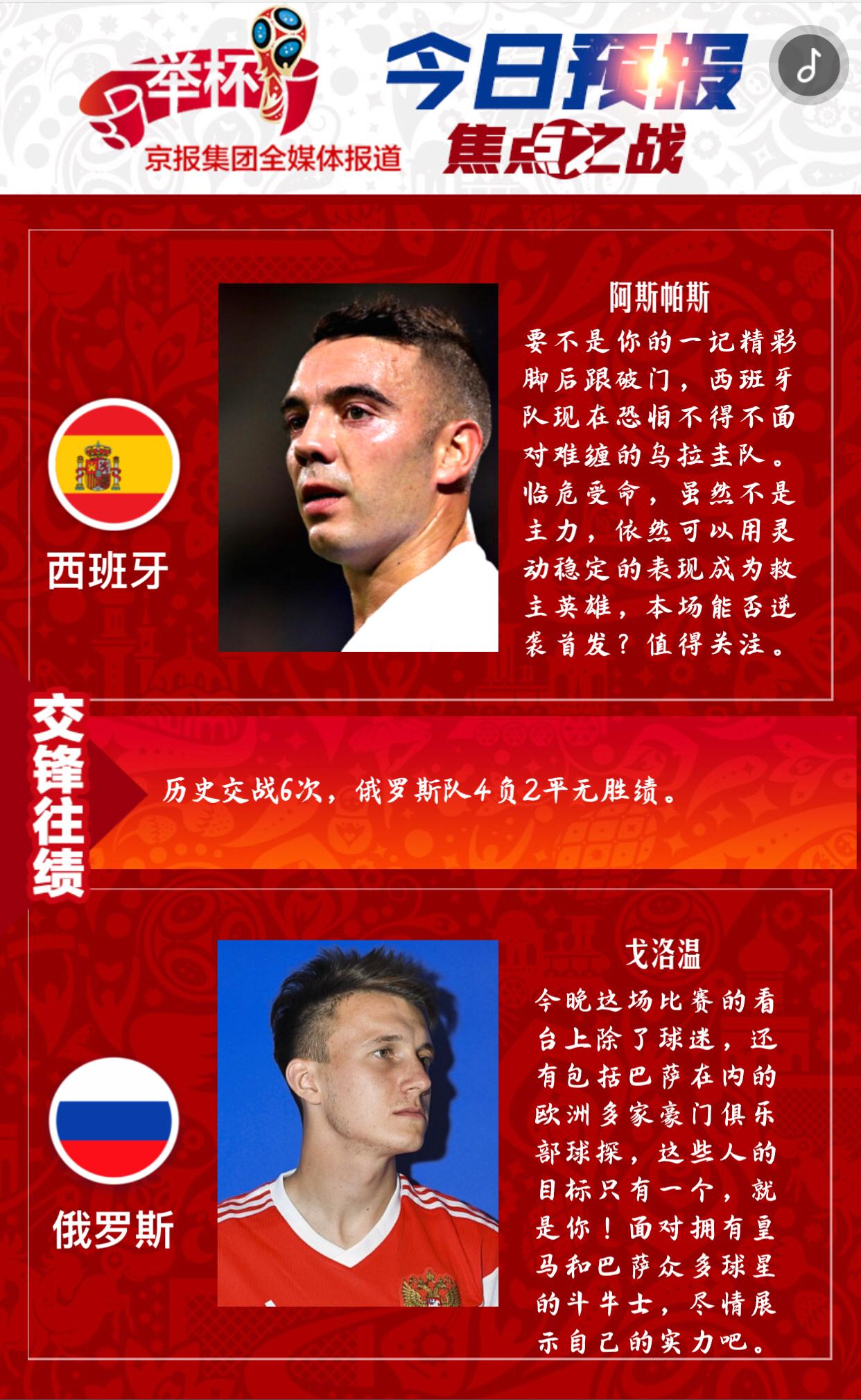虽然俄罗斯队在欧洲足坛只算二流,但凭借东道主优势在本届杯赛上也是战力爆表,尽管末轮在乌拉圭队身上吃到苦头,但也让战斗民族一下子冷静了。这下可好,一头学会了思考懂得使用谋略的巨熊,足够斗牛士们喝一壶的。今晚10点,这场让人心跳加速的对决即将来袭!
