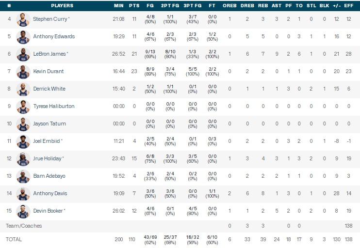 本场美国男篮运动战69投43中,其中三分球32中18。数据方面,美国男篮杜兰特9中8得到23分2板,詹姆斯21分7板9助,库里11分3板3助,朱-霍勒迪15分4板3助2断; 塞尔维亚男篮约基奇20分5板8助4断,博格丹14分6板1助,多比利奇13分2板。