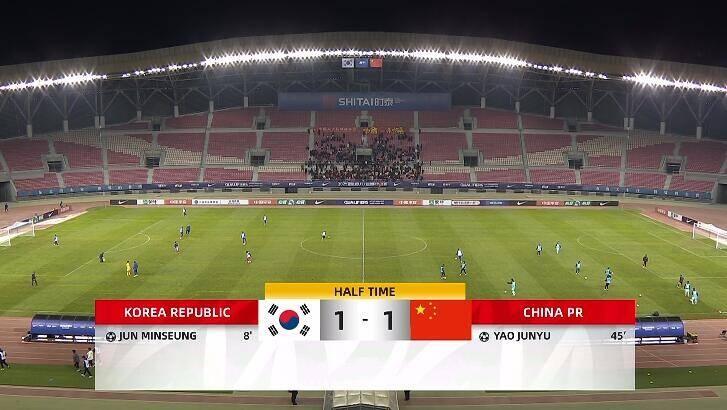 直播吧10月27日讯 北京时间10月27日晚上19:35,U17亚洲杯预选赛第5轮,中国U16对阵韩国U16。上半场,全敃昇乱战破门,姚俊宇扳平。半场战罢,中国U16暂1-1韩国U16。