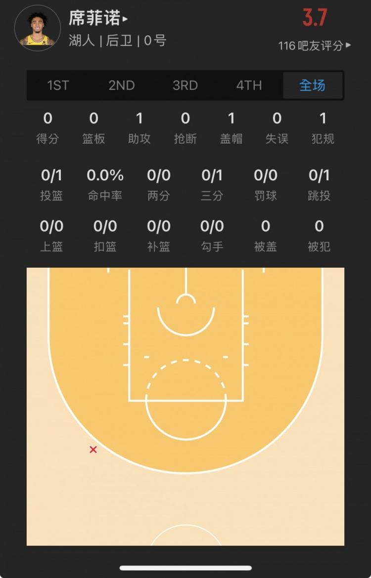 湖人17号秀 杰伦-胡德-席菲诺 出战2.2分钟