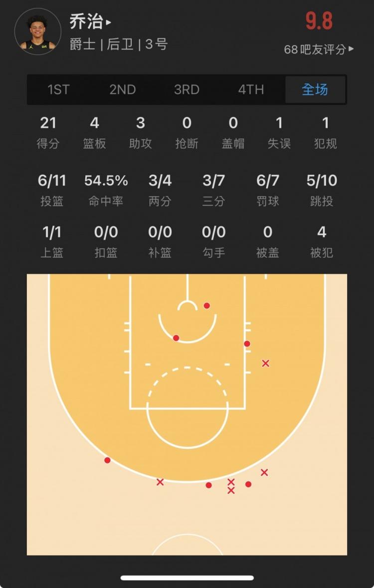 爵士16号秀 基昂特-乔治 出战26.7分钟