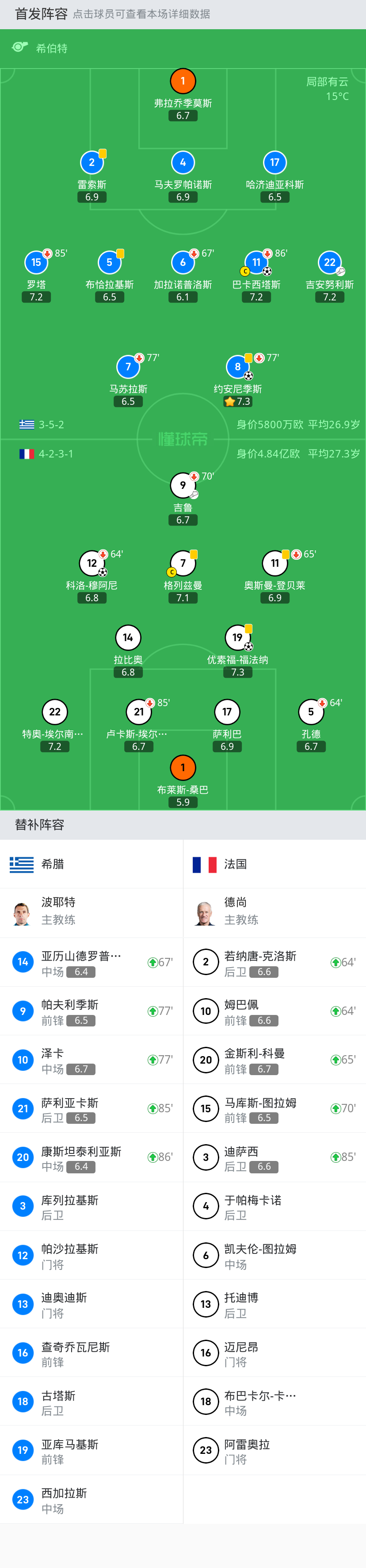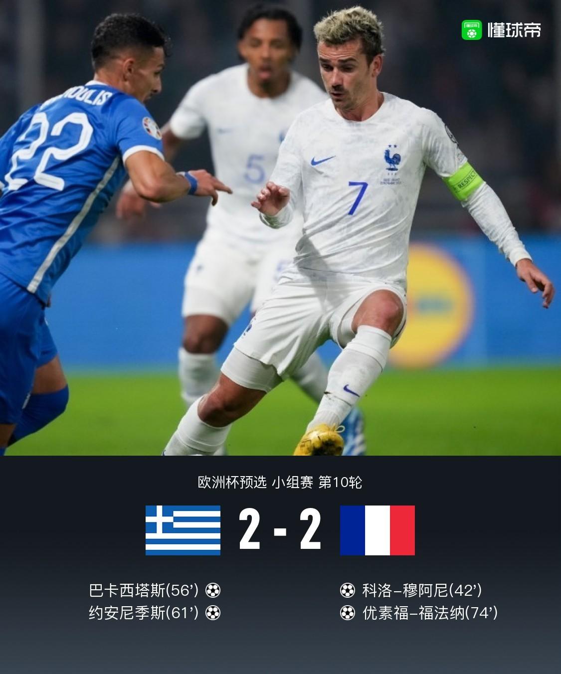 北京时间11月22日欧洲杯预选 小组赛 第10轮,希腊主场对阵法国。上半场,格列兹曼远射被弗拉乔季莫斯侧身扑出,格列兹曼单刀凌空打门中柱,吉鲁脚后跟助攻穆阿尼小角度爆射破门;下半场,巴卡西塔斯世界波破门扳平比分,吉安努利斯过掉防守后助攻约安尼季斯破门反超,姆巴佩助攻福法纳远射得手,科曼回传变线先后击中两侧立柱,补时阶段姆巴佩远射被扑后中楣弹出。最终比分2- 2。