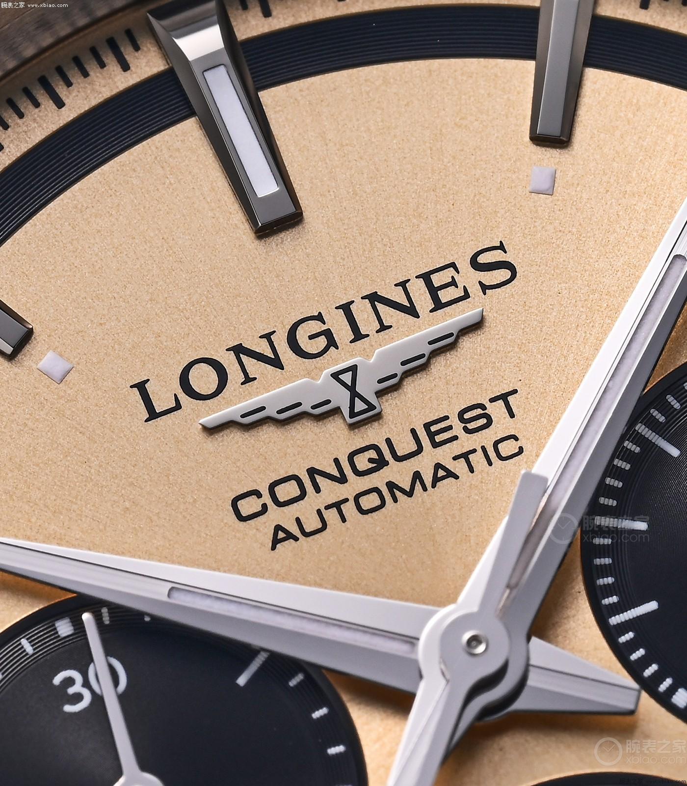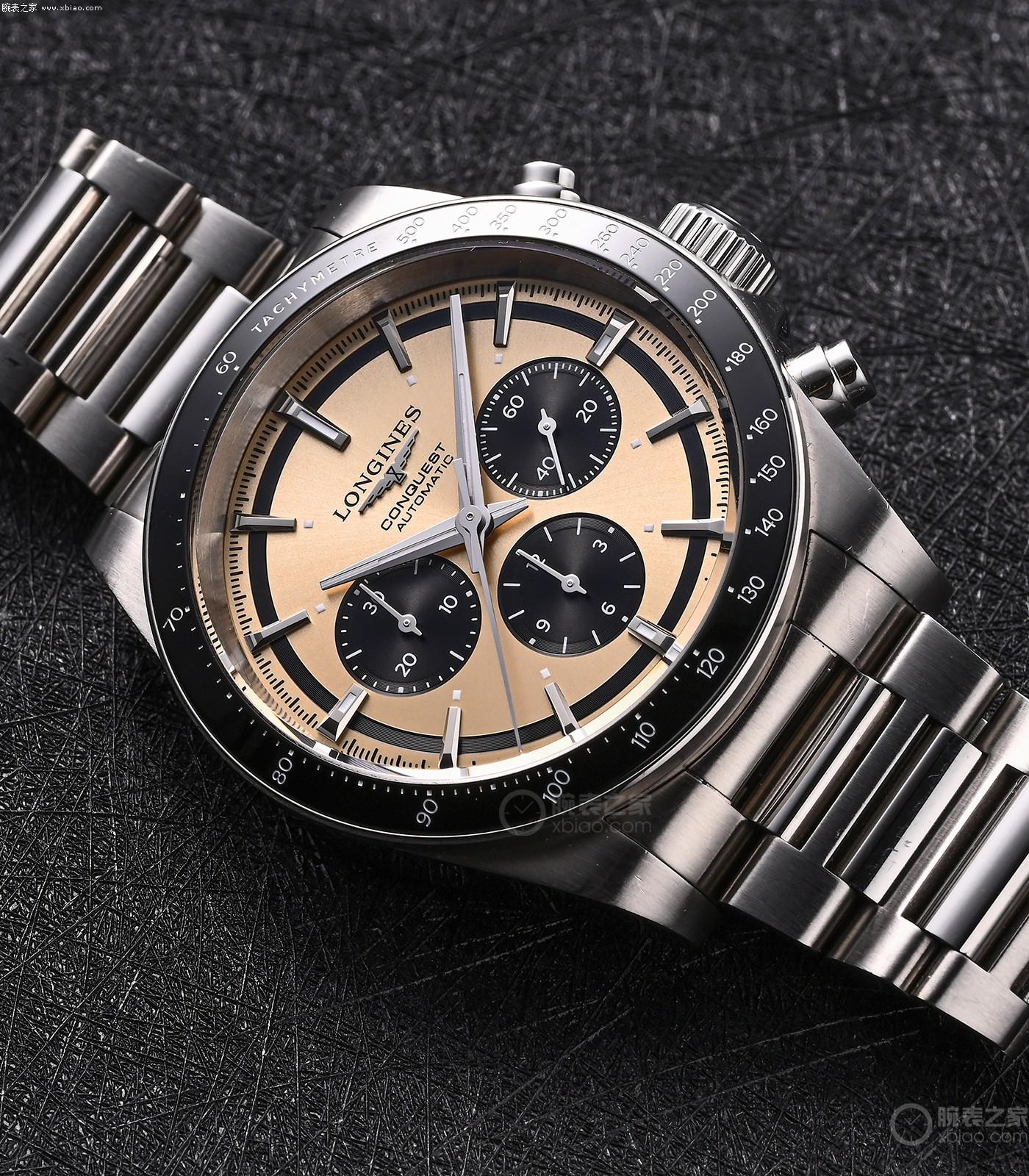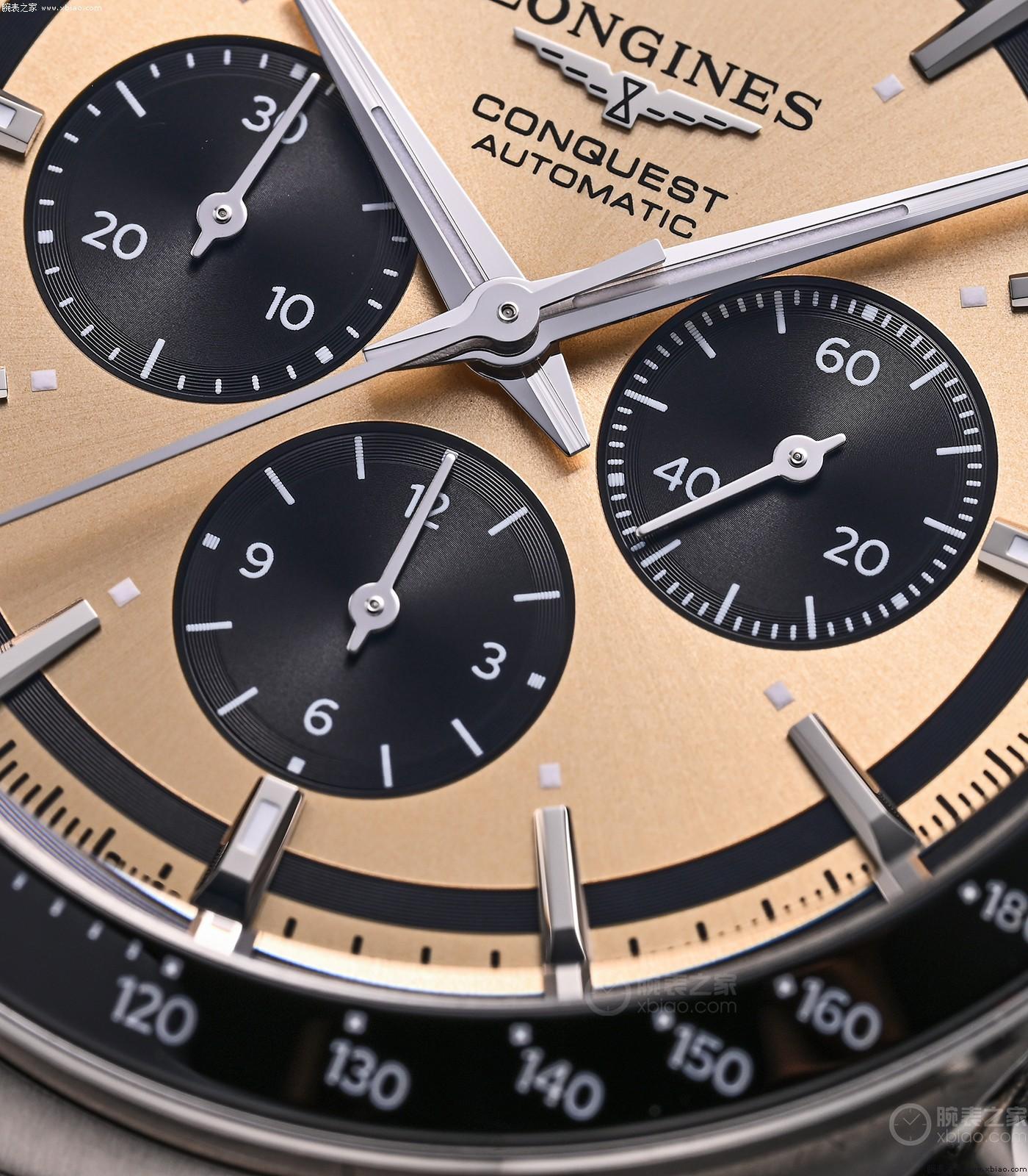 浪琴新款康卡斯计时表,有黑、白、蓝、香槟,多种配色,其中这只香槟色,黑色的三眼计时盘和黑色陶瓷圈,同样有“熊猫盘”的神韵。虽然康卡斯计时的表盘,整体走现代风格,但盘面外侧的一圈扭索纹黑圈,让手表有了那么一点儿“sector dial”(分区表盘)的复古味道。同时,在每个条形立体时标的前端,都有一个小小的夜光点。这种设计在上世纪90年代、21世纪初的名表上,经常能见到,这又为新款康卡斯计时表带来了一些复古气息。