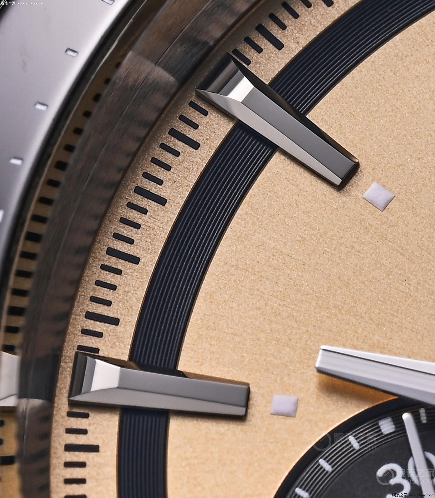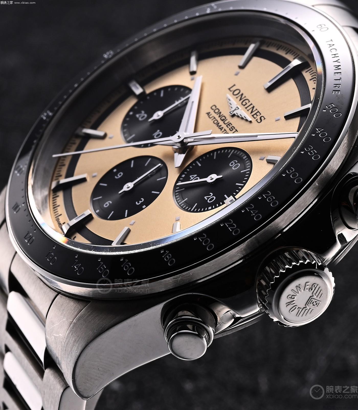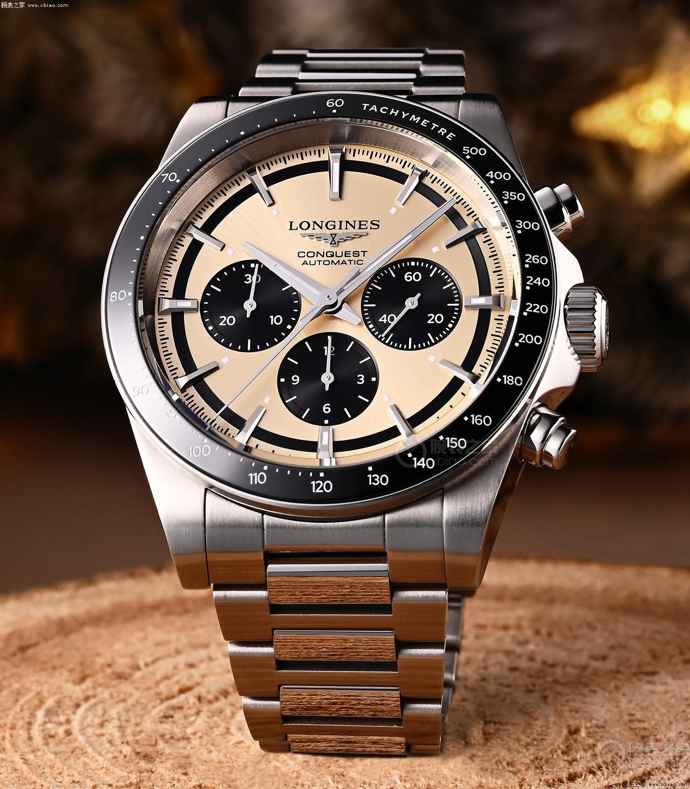 浪琴新款康卡斯计时表,有黑、白、蓝、香槟,多种配色,其中这只香槟色,黑色的三眼计时盘和黑色陶瓷圈,同样有“熊猫盘”的神韵。虽然康卡斯计时的表盘,整体走现代风格,但盘面外侧的一圈扭索纹黑圈,让手表有了那么一点儿“sector dial”(分区表盘)的复古味道。同时,在每个条形立体时标的前端,都有一个小小的夜光点。这种设计在上世纪90年代、21世纪初的名表上,经常能见到,这又为新款康卡斯计时表带来了一些复古气息。