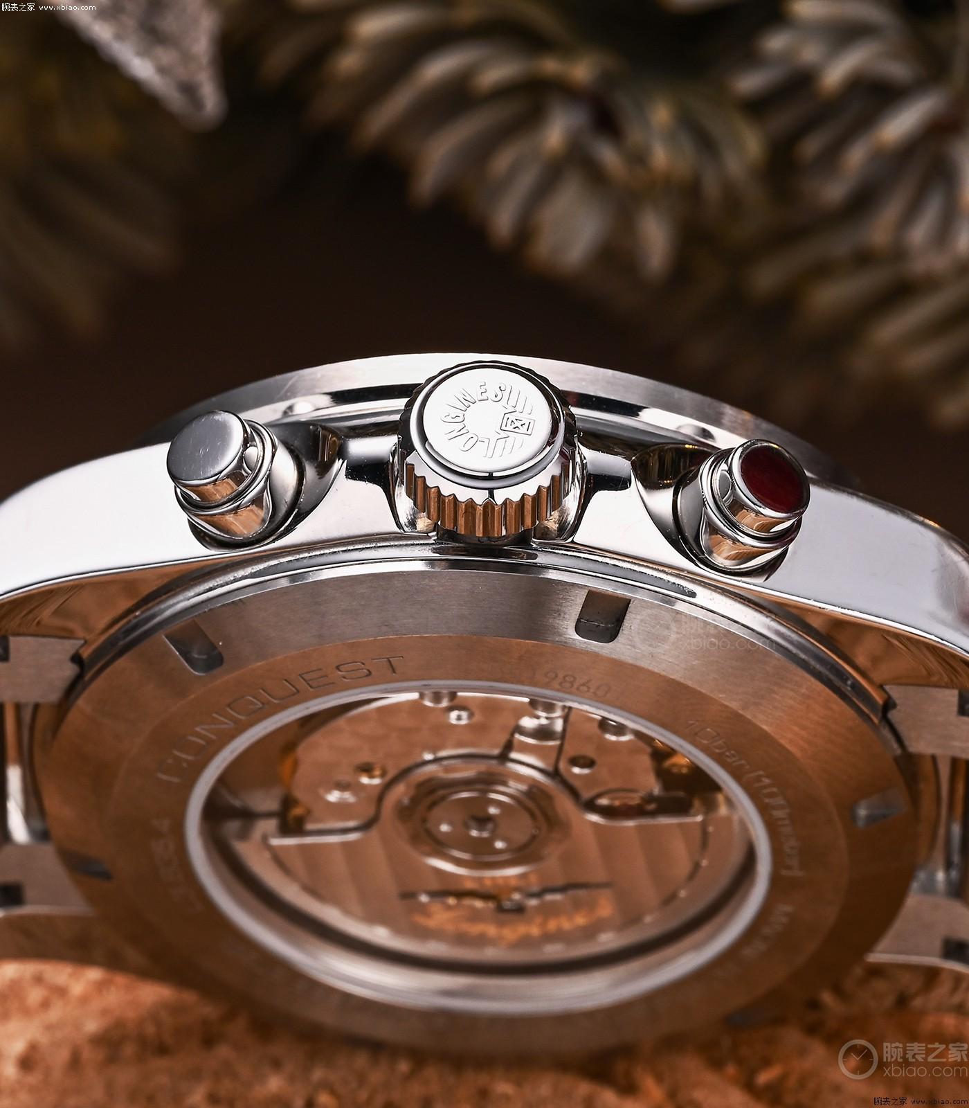 虽然是模块化计时机芯,但计时按钮、表冠,处于同一层。