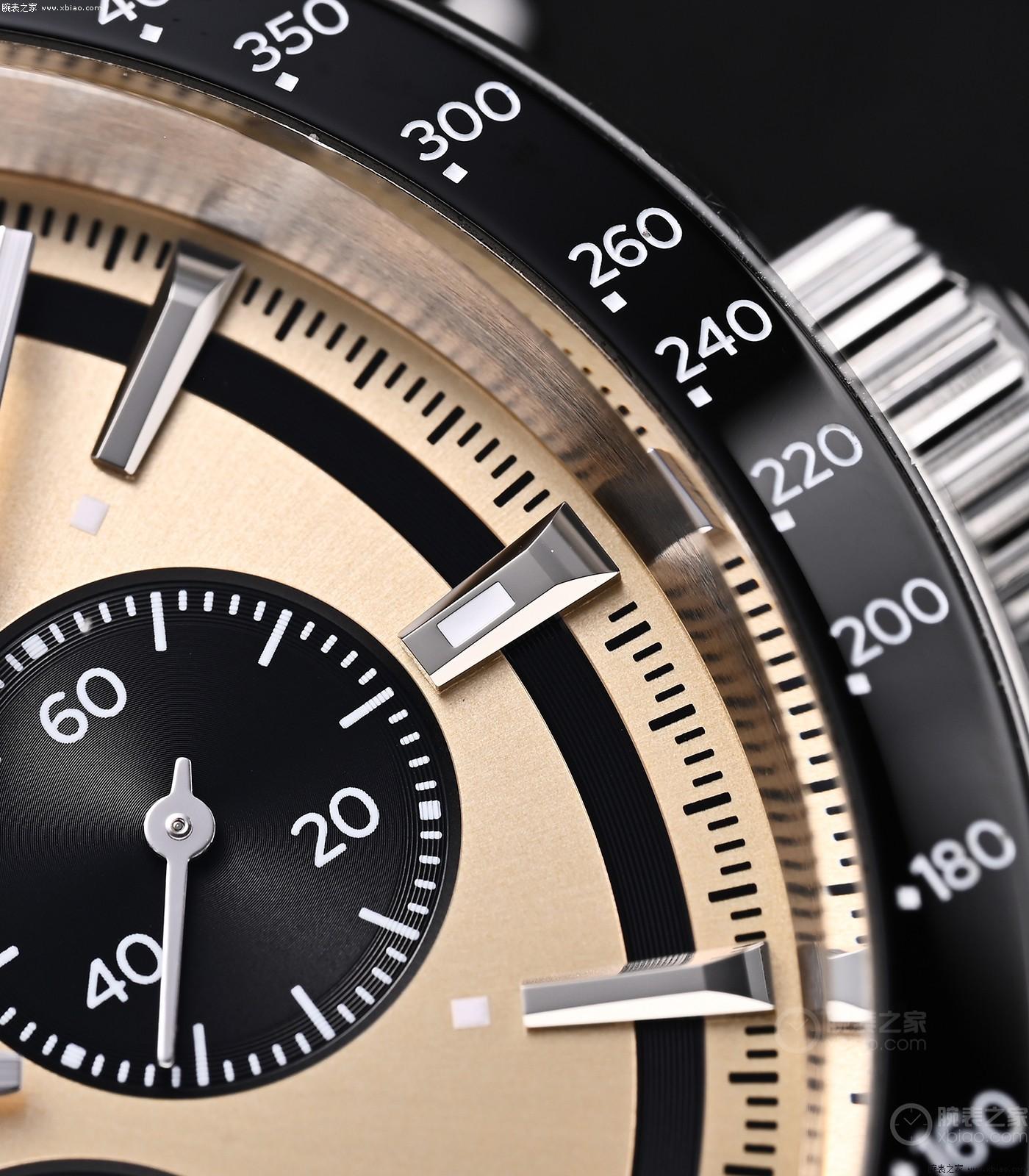 除了上述细节外,在整体设计上,“特别纪念版”迪通拿126529和今年完成更新换代的新一代迪通拿一致。比如,陶瓷圈外缘,有金属包边,包边材质和表壳一致,是18K白金包边。盘面时标,是偏细长的新款时标。这些都没有变化。