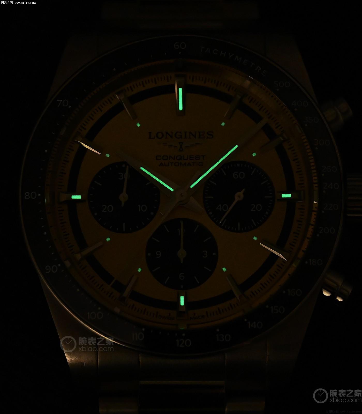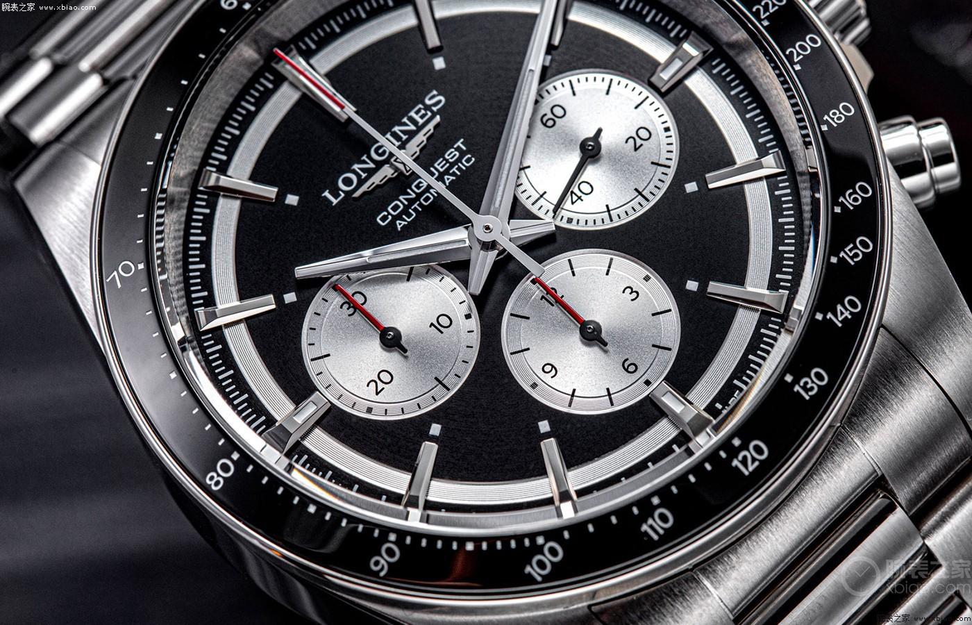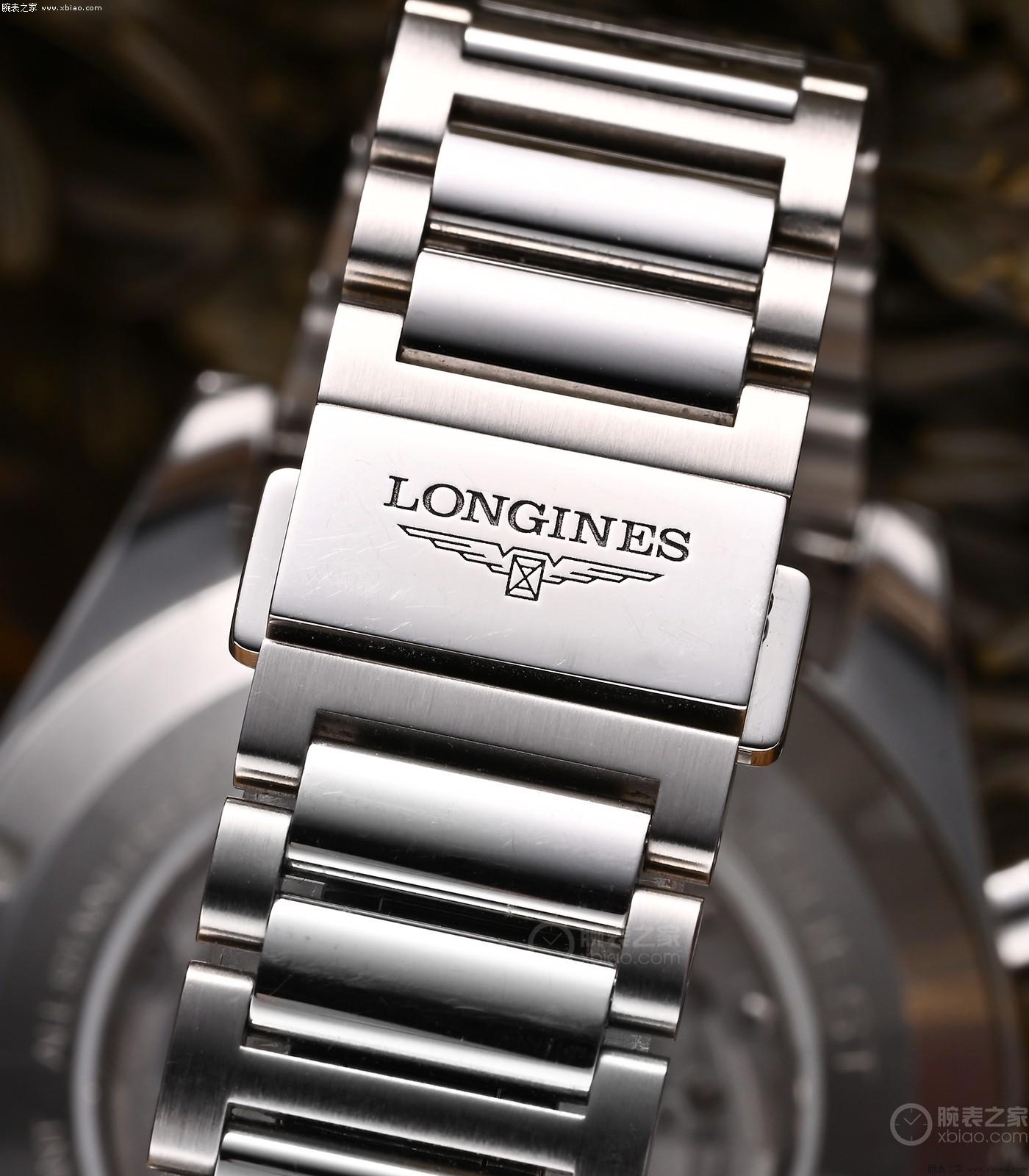 同级别中,浪琴在配置和细节装饰上,一向是富有且慷慨的。康卡斯计时的三眼计时盘,外圈有环形扭索纹装饰,内圈有细密的唱片纹装饰。手表指针有抛光、拉丝两种处理。时标有多个抛光切面,盘面还有放射的太阳纹装饰。细节非常到位,在同级中足够出色。