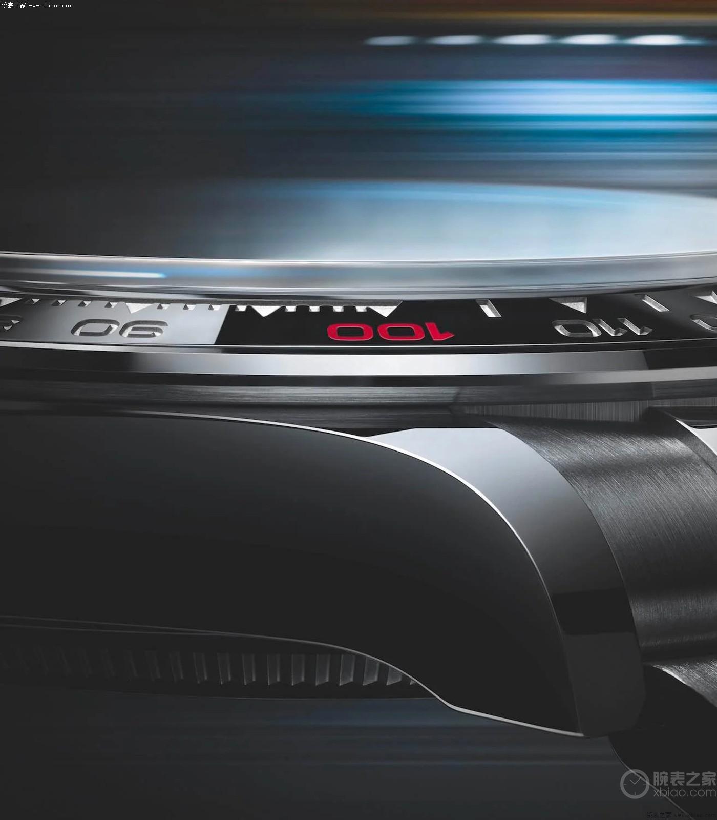 手表使用陶瓷表圈,表圈上有有测速圈,并有红字点缀。康卡斯计时表,有锁把,防水100米。