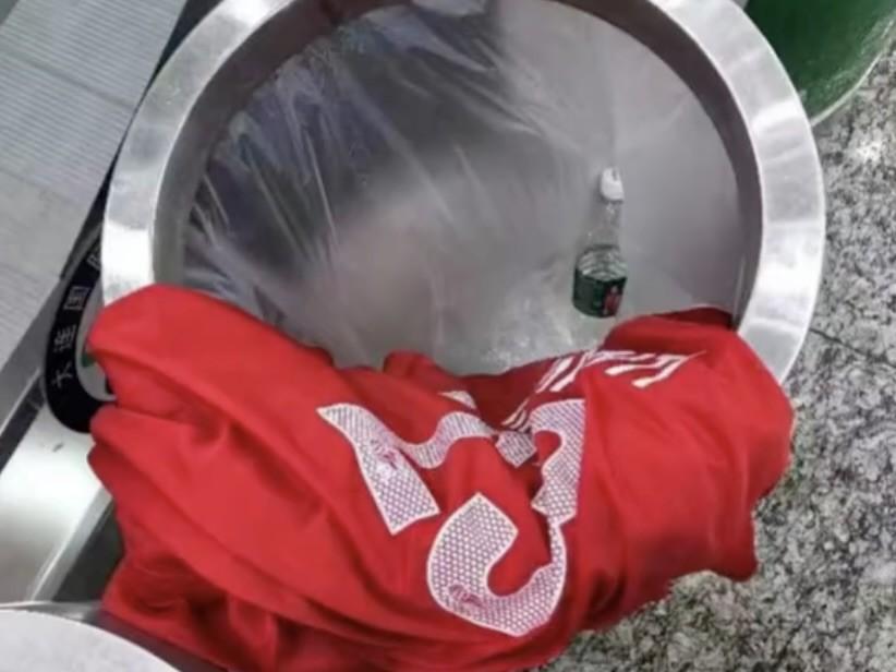 该博主发文称:“这个队服是通过安检跑向广州队球员面前,当着大家的面儿扔垃圾桶里,大连某些球迷素质真高。”