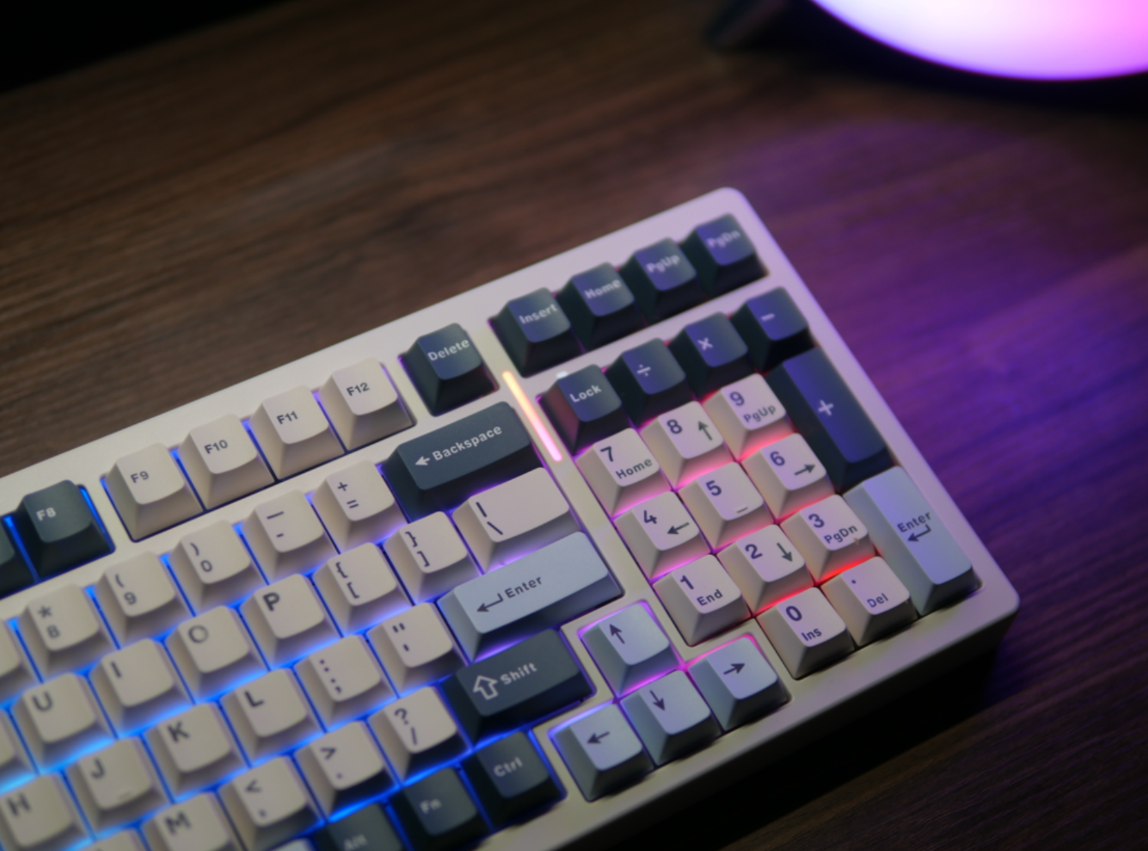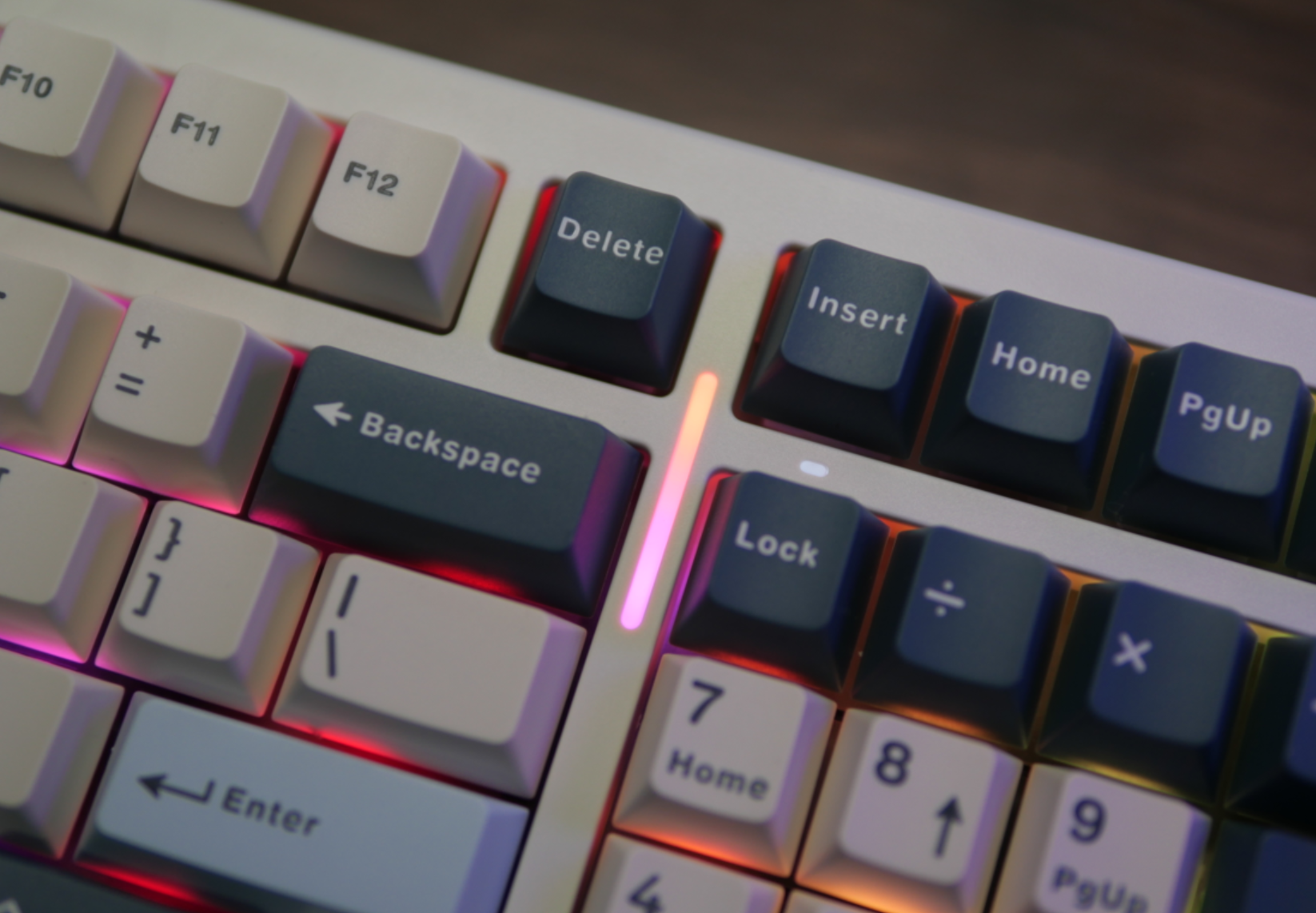 让我比较好感的一个地方在于这把键盘的边缘是做了一个弧面倒角的设计,真的是很能提升整把键盘的高级感。caplock和numlock两颗按键的指示灯分别在它的旁边和顶端,很不错的一个设计。不过numlock这个灯日常使用角度下是看不到的,你要确定它是否打开需要特意伸头去看一眼。而它的侧面是一个RGB灯条,做了柔光处理,亮度是比较合适的,不会刺眼。