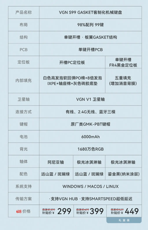 2022年双11,vgn V98pro上市,血洗了当时的机械键盘市场。2023年618,短短的半年多之后,VGN的S99系列上市,这次不但卷了友商,甚至连自己一起卷了。