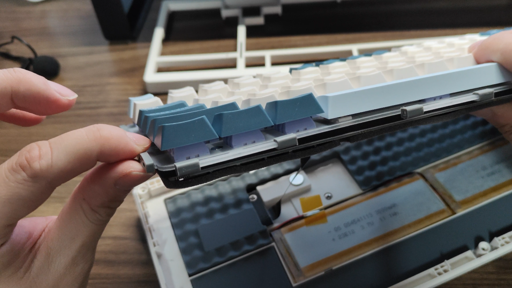 底部是分体式的硅胶,一共6000mAh的大电池。背部的泡棉是直接粘在PCB上面的,揭开可以看到开槽开的还是很彻底的。另外凯华的轴座已经是VGN不用说的卖点了。PORON夹心棉送测版本是黑色的,大货会改成白色,视觉效果更好。