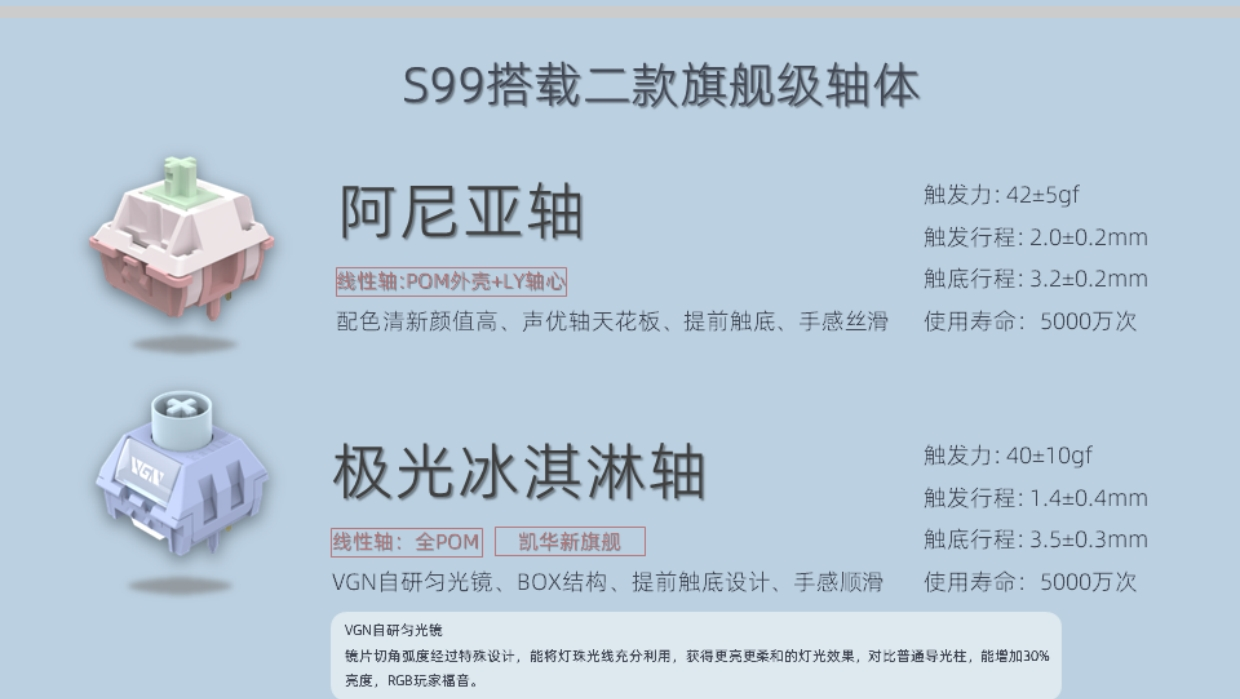 有人说就VGN这次是在自己卷自己,直接把V98pro也卷了(咦,我开头好像也这么说的..),不过在VGN内部这两把键盘确实是有明确的定位差别的。那就是V98pro主打的是游戏键盘,而S99虽然也支持SMARTSPEED超低延迟技术,但是因为内胆比较软,所以它是一个主打更舒适文字输入的一把键盘。