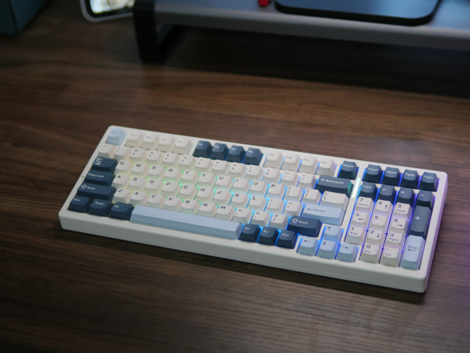 正面是一个常见的98+1的设计,F区挤出一个位置给Delete键,避开了专利问题,这也是目前98配列中最好用的一种。