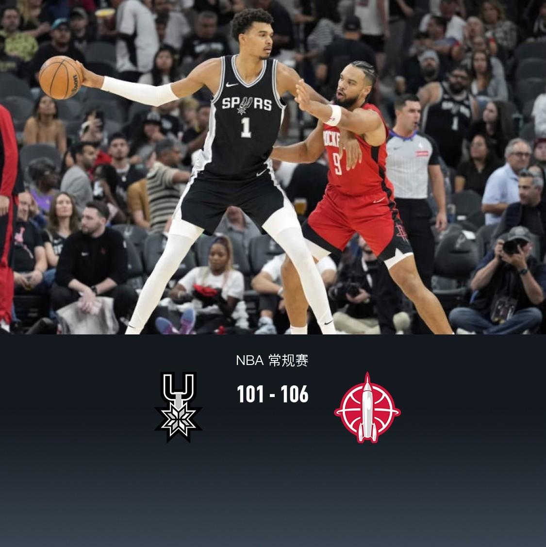 第四节马刺文班亚马拿下7分,火箭杰伦-格林拿下8分,最终马刺101-106不敌火箭