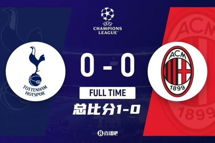 全场比赛结束,最终热刺0-0战平米兰,总比分0-1被淘汰。