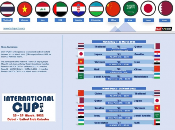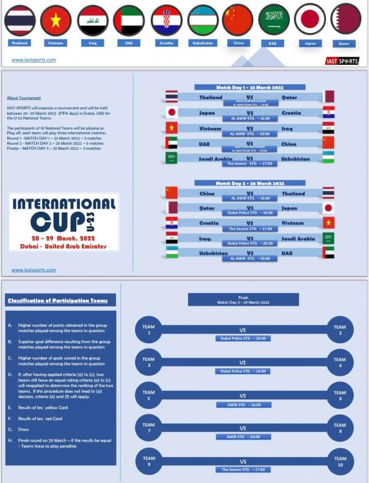 随着迪拜杯的参赛球队确定,赛事组委会也公布了最终的赛程。本届迪拜杯一共有10支球队参赛,中国U23国家队将在23日面对东道主阿联酋,26日迎战越南U23国家队。29日排位赛的对手待定。