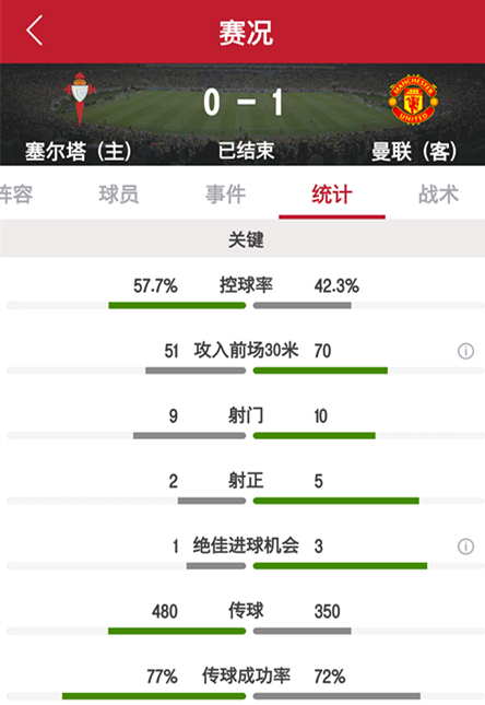 曼联尽管让出控球权,但获得的进攻机会更多,射正次数和绝对机会都压制塞尔塔,1球优势在手回到主场将势必更加轻松。
