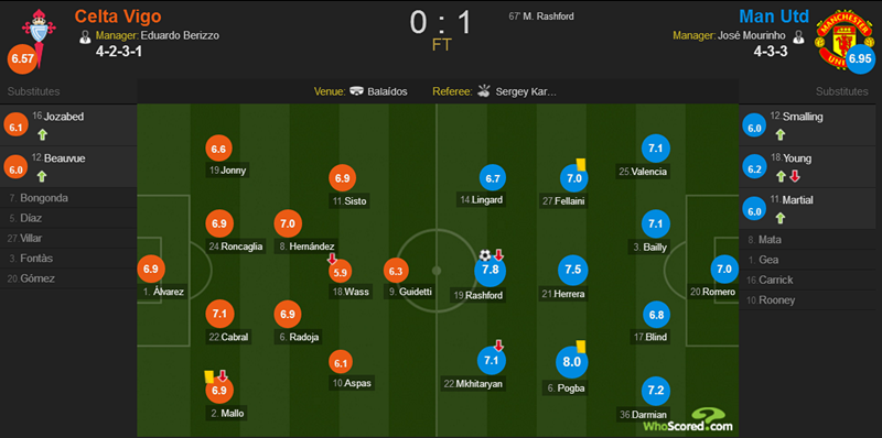 本场比赛最高分给到了曼联中场核心博格巴,进球功臣拉什福德同样获得好评;塞尔塔方面,全队得分均不高,几乎都在6、7分左右徘徊。