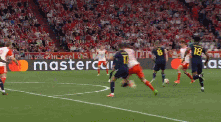 第17分钟,诺伊尔面对贝林厄姆逼抢,匆忙出球传给对方