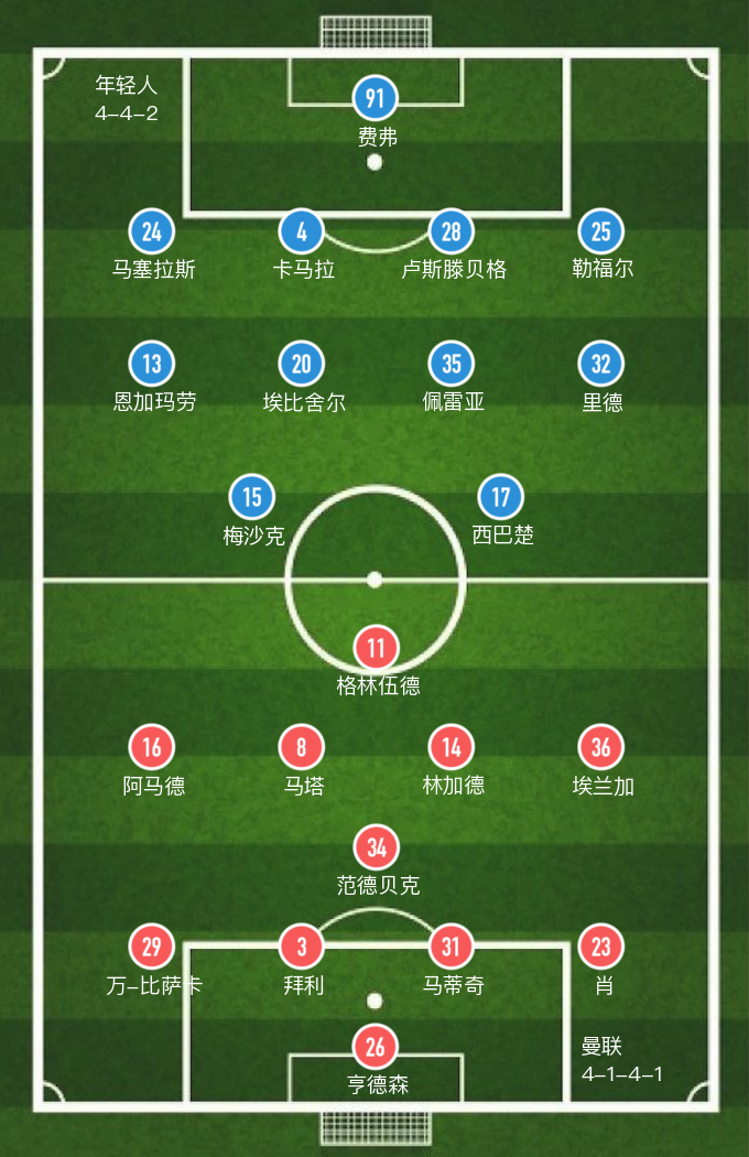 曼联首发:26-迪恩-亨德森(68’22-希顿)、29-万比萨卡、3-拜利、31-马蒂奇、23-卢克-肖(61’43-门吉)、34-范德贝克、8-马塔(89’72-查理-萨维奇)、14-林加德(89’73-伊克巴尔)、16-迪亚洛(68’47-肖雷蒂雷)、11-格林伍德、36-伊兰加