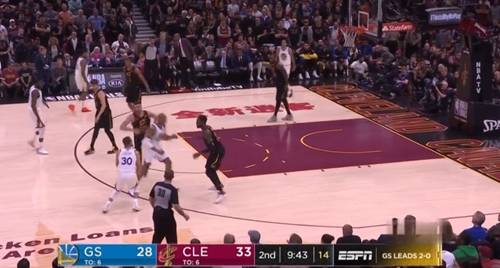 骑士防守端有无球皆采用无限换防,并且“雪藏”乐福:一旦逢库里与乐福防守人打挡拆,骑士采用双人夹击库里,逼其他人处理球,尽量避免乐福被库里从三分线追打——勇士开局失误3次,骑士率先14-4开局。