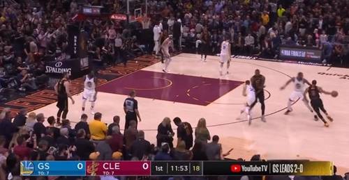 开场,骑士主打勒布朗+乔治-希尔/JR-史密斯(库里防守人)发起挡拆进攻,勒布朗试探勇士的防守策略:一旦勇士逢挡拆换防,勒布朗错位单挑库里/麦基,“麦迪式打板自抛自扣”;一旦勇士夹击勒布朗,勒布朗快出球找特里斯坦-汤普森内线终结亦或联动外围埋伏的射手群。