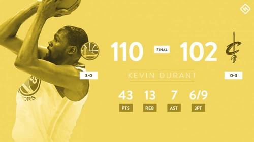 凯文-杜兰特以一己之力扛起了金州勇士,他打出了此前勒布朗式的孤独领袖担当:水花合计27投7中、三分球15中3;阿杜23投15中、三分球9中6,力挽狂澜的43分13篮板7助攻——这是他八年季后赛拼争的最高得分。