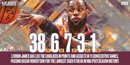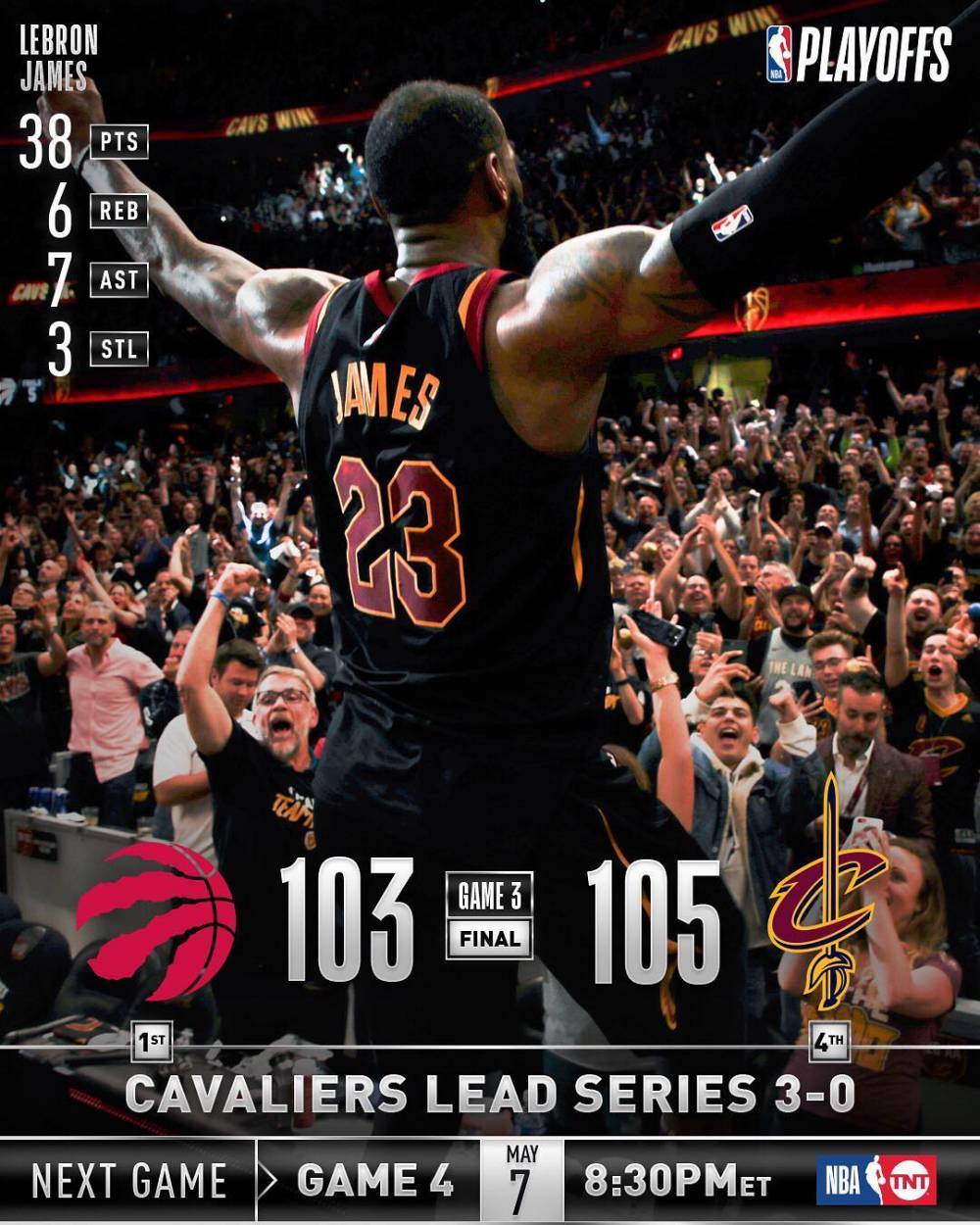 詹姆斯对于东部的统治已经有八年之久,而且到现在也没有任何衰退的迹象,他在系列赛第三场比赛狂砍38分7助攻以及6篮板率领球队105-103取胜,又一次将猛龙逼至出局的边缘之上。
