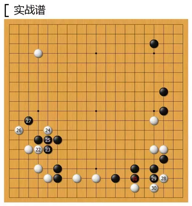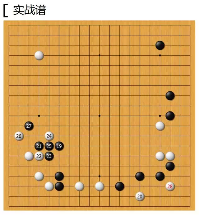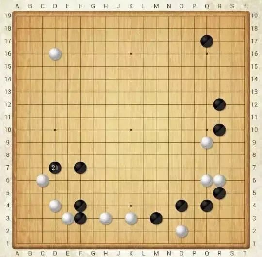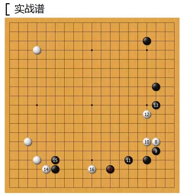 实战黑17逼住,对右下角做一下防守,虽然角上还有点角的空间,并没有成实地,但是加固本身就是很有价值的,只要右下显得厚实,白棋右方三子就会显得越发薄弱。