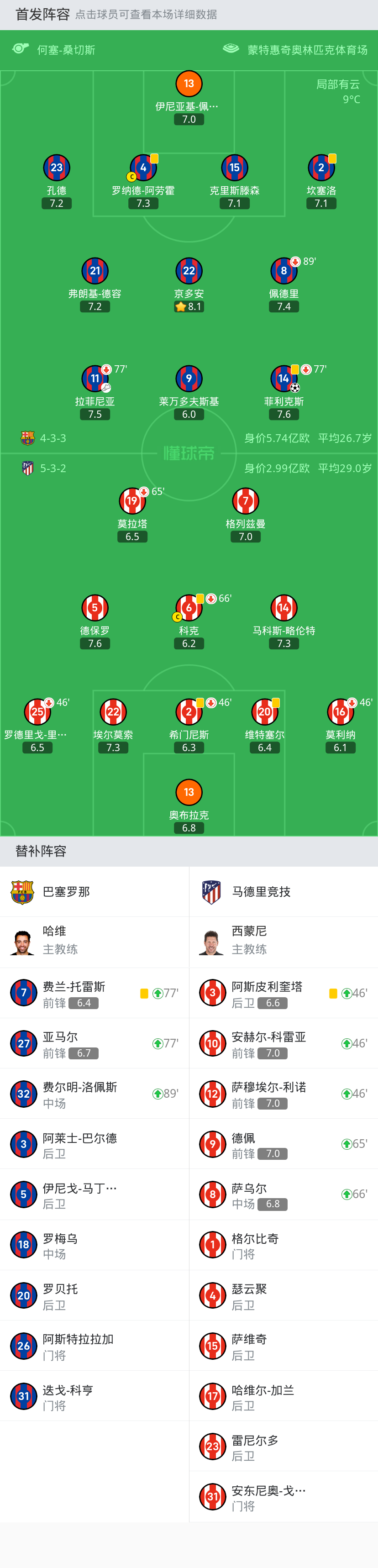 上场替补:77'7-费兰-托雷斯, 89'32-费尔明-洛佩斯, 77'27-亚马尔