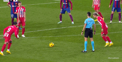 马德里竞技 首发:20-维特塞尔, 13-奥布拉克, 7-格列兹曼, 19-莫拉塔, 6-科克, 5-德保罗, 2-希门尼斯, 22-埃尔莫索, 14-马科斯-略伦特, 16-莫利纳, 25-罗德里戈-里克尔梅