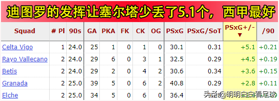 根据西甲官网的统计,塞尔特门将迪图洛这赛季减少了对手5.1个进球,是全联赛最出色的。