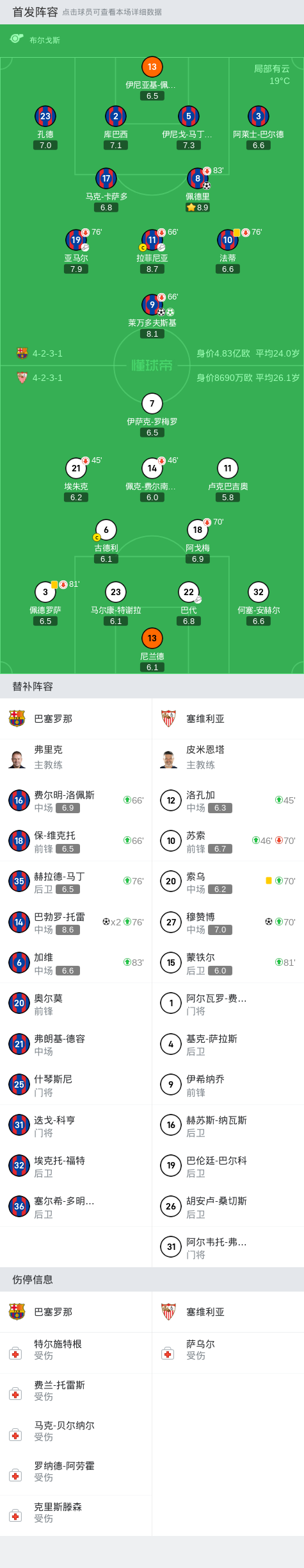 巴萨VS塞维利亚 ,堪比国王杯决赛,你觉得巴萨首发11人会是怎么样的?谢谢邀请!巴萨客场迎战状态良好的塞维利亚。这场比赛对与双方都是非常重要!赛前巴萨渴望连胜尽快锁定联赛冠军的席位。而主队塞维利亚也想战胜巴萨从而尽快锁...